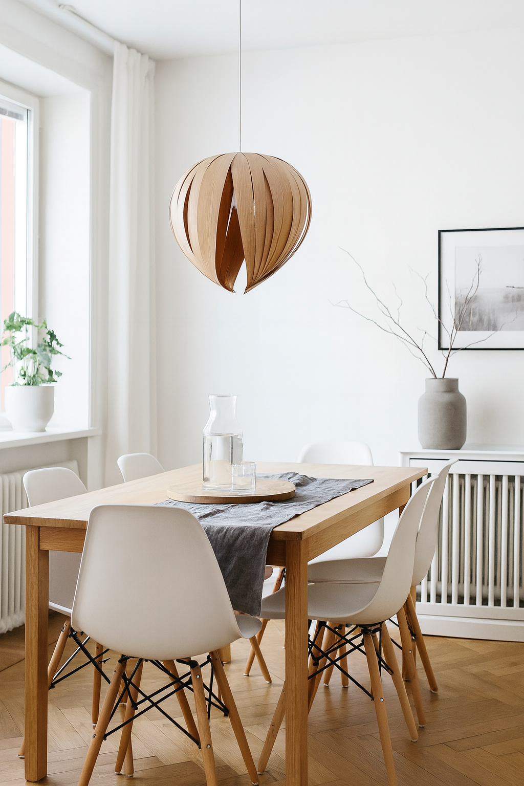 The Gladys Medium / Oak semi-open hanging lamp blends natural oak elements with a timeless floral design, creating a warm and inviting atmosphere. Perfect for dining rooms, bedrooms, or living spaces, it offers soft, ambient lighting that enhances any décor. Its elegant yet understated style adds a natural touch of sophistication and comfort to your home environment.