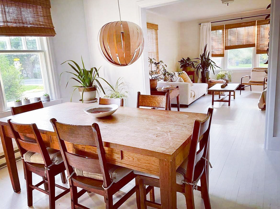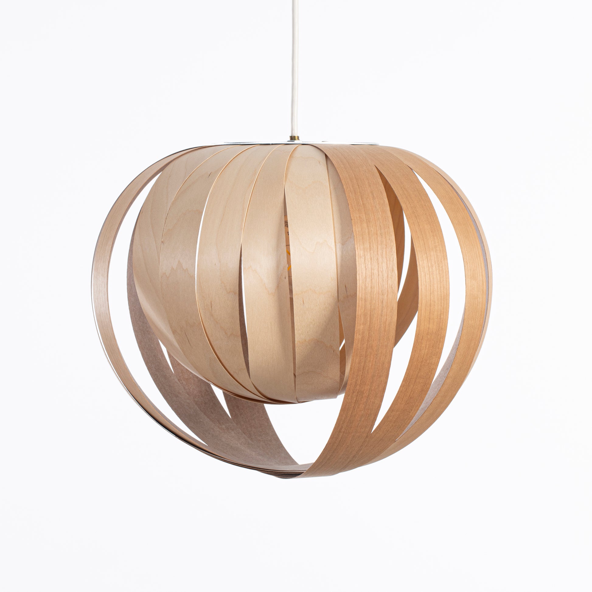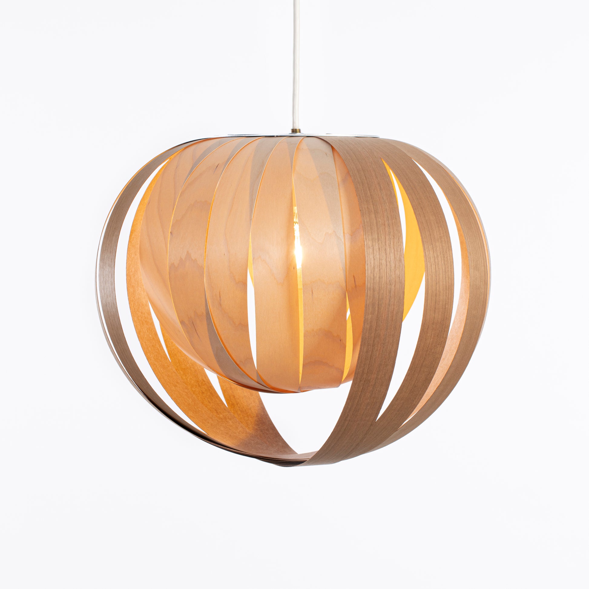 The Noisette #3 Inverted hanging lamp blends mid-century design with natural elegance, featuring a handcrafted mix of red and white birch wood. Its unique inverted shape diffuses ambient light softly, creating a warm and inviting atmosphere. Ideal for those seeking a sophisticated lighting solution that complements both modern and classic interiors with the timeless beauty of wood.