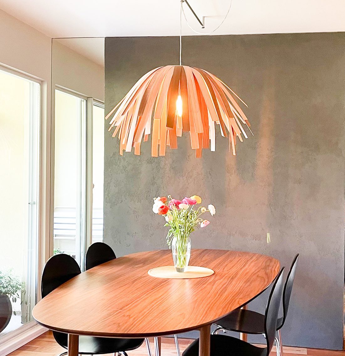 La suspension Tina Tricolore marie avec audace le merisier rouge, le merisier blanc et le noyer dans un design mi-long au charme singulier et indompté. Sa composition échevelée révèle la richesse des textures et des nuances du bois, faisant de chaque pièce une création unique. Alliant lumière fonctionnelle et présence sculpturale, elle s’impose comme un élément central, apportant à l’espace une touche unique, organique et artistique.